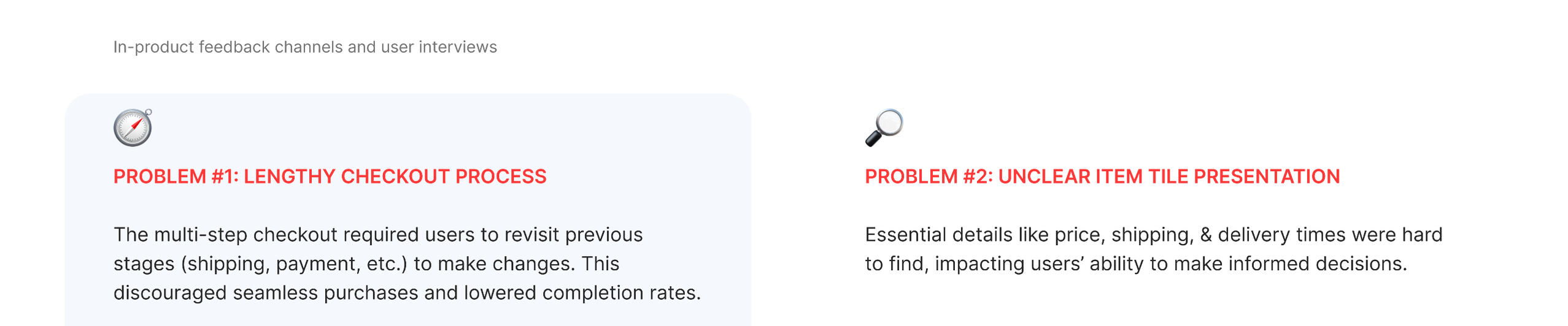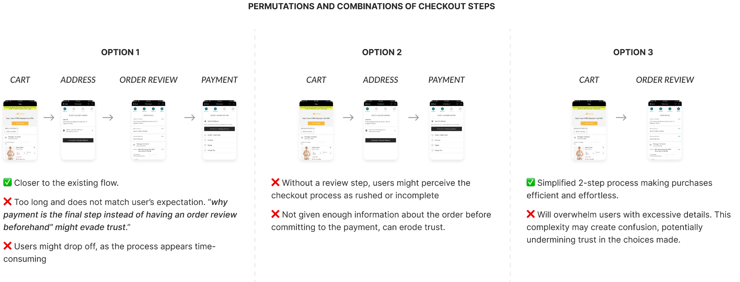 We ran a deep dive on Cart, and Checkout experience to get to know pain points and improvement areas.